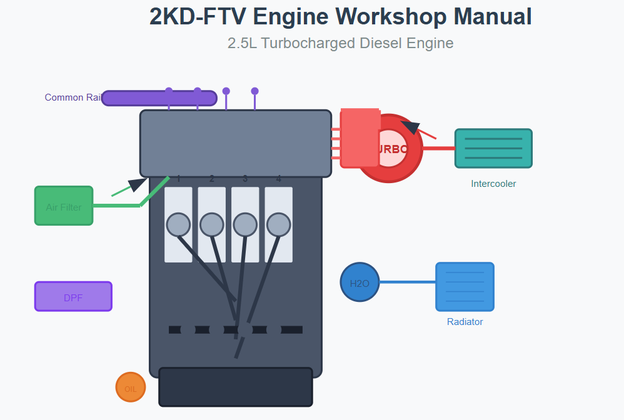 The 2KD-FTV engine is widely used in Toyota Hilux, Hiace, Fortuner and other vehicles, features a Common Rail system and turbocharging, providing a balance of power and economy.